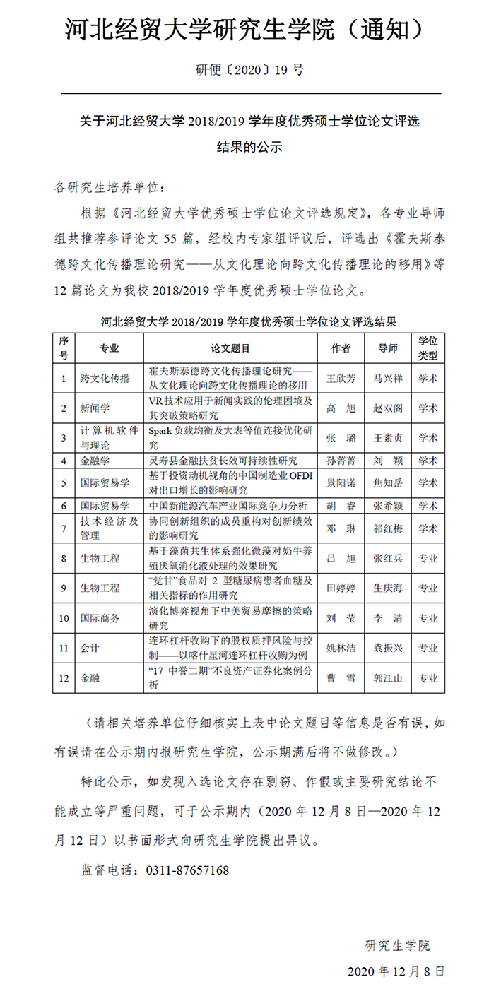 关于2018/2019学年度优秀硕士学位论文评选结果的公示