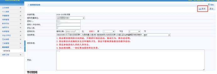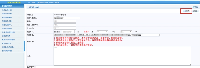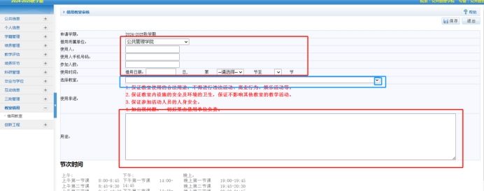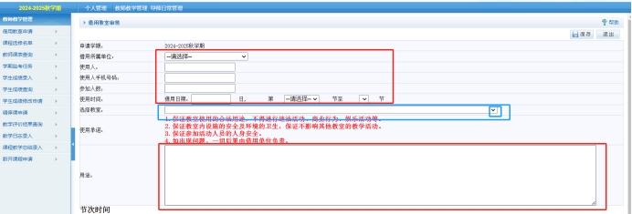 (3)按规定填写相关信息。使用时间填写完成后,蓝色方框内的下拉菜单即可显示空余教室,若下拉菜单中没有显示,则表示此时间段没有空余教室。