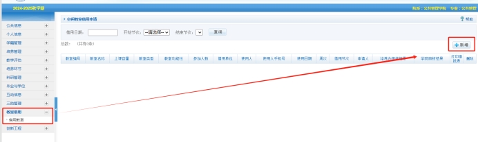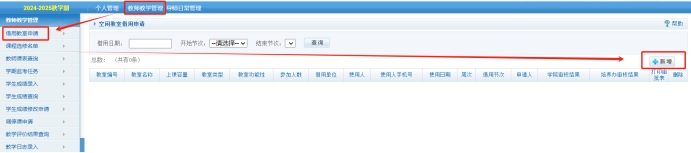 (2)点击“教师教学管理-借用教室申请-新增”。